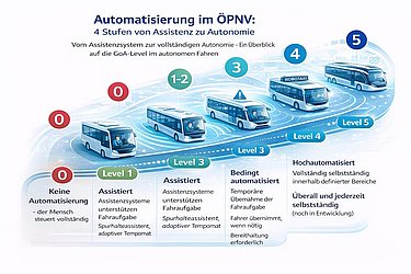 Um die Entwicklungen im Bereich des autonomen Fahrens richtig einordnen zu können, ist es hilfreich, einen Blick auf die GoA-Level (Grades of Automation) bzw. die Automatisierungsstufen zu werfen.